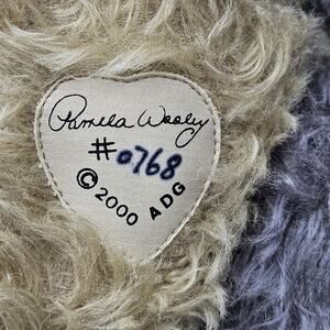 This collectible teddy bear was designed by Pamela Wooley for Ashton-Drake Galleries in 2000, numbered #0768, with a signed heart-shaped patch on the back.