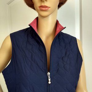 Ashworth Golfing vest, navy, lightly quilted, pink lining, zip front, zip side pockets, high neck