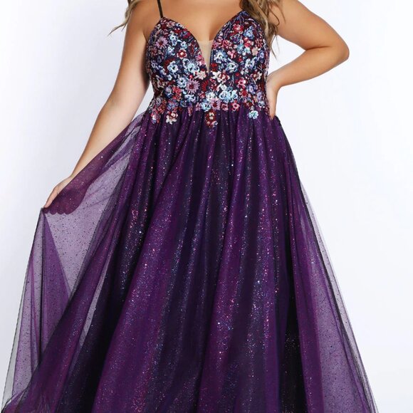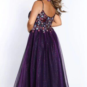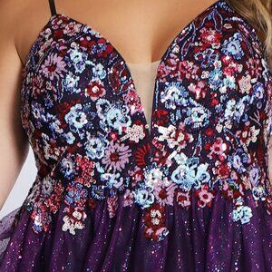 This flirty and fun dress is a showstopper! The bodice of the gown has a deep V-neckline, thin straps, and a scoop back. The neckline features a sheer insert that adds support and coverage. The bodice is intricately beaded in floral patterns. The beading fades into the top of the full skirt, which is made of a sheer overskirt. The overskirt is made of sheer tulle that has glittery flakes embedded into the fabric, causing it to sparkle and shine. The horsehair hem finishes off the skirt perfectly. This gown is so detailed and stunning, and would be perfect for any formal event especially prom!