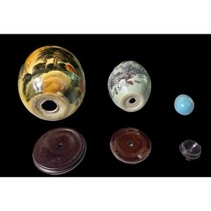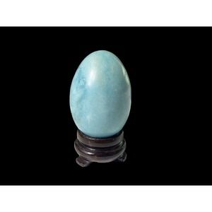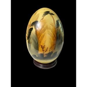 This beautiful collector egg boasts a stunning Asian-inspired design with intricate hand-painted details. Crafted art with these eggs features a colorful forest and fisherman scene that is sure to impress. Blue egg is made out of stone that weighs 6lbs. The set includes three eggs of varying heights (9 in, 7 in, and 3 in) with stands, making it a wonderful addition to any collection.