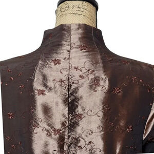 Shiny bronze with embroidered floral accents throughout, it has small muted orange roses down the front with loop closures.