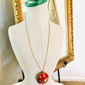 Red floral costume fashion lightweight pendant/brooch necklace. This necklace feels souvenir quality, not high end, extremely lightweight and hollow. Chain kinks easily.