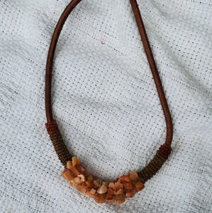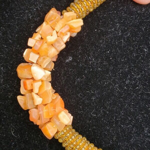 I don't know whether or not this is vintage. Measures 16 inches that has gorgeous amber colored beads around the shells. Thick leather cord. This is your all-season statement without brash statement necklace. I bought this at an Asian home estate sale and the woman said it was bought in Asia. Taking her word for it.