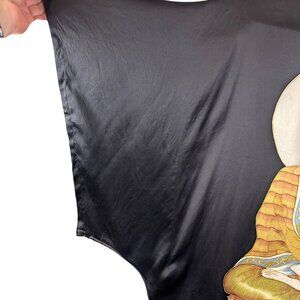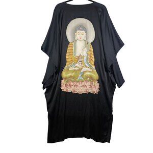 This Asian Image black kaftan features a serene Buddha print on both sides, crafted from 100% silk for a luxurious feel and elegant drape. Buddha is often associated with the cultural and spiritual heritage of both countries. Dress has an original style - RARE!