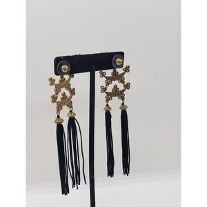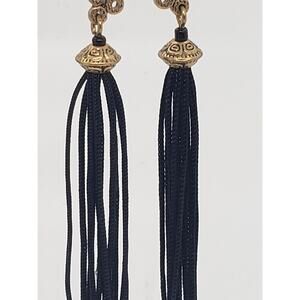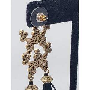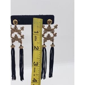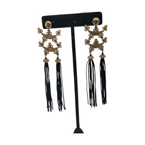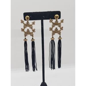 Asian Inspired Dangle Earrings Gold Tone Black Tassel Long Drop Pierced Fringe