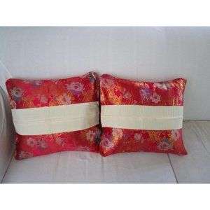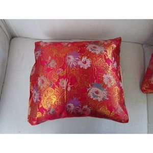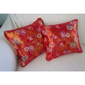 Asian Inspired Raspberry Chrysanthemum Floral Gold Accent Brocade Pillow Covers