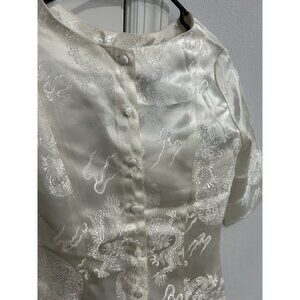 vintage, retro, dragon, satin set, dragon print, ivory clothing, women's ensemble, formal wear, cultural attire, brocade fabric, satin fabric, elastic waist, button closure, 3/4 sleeve, medium size, sophisticated style