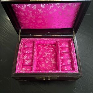 This beautiful wooden Asian jewelry box with brass accents btw and jade piece on the top has pink satin lining with removable tray. Exce condition. 3.5” x 8” L x 5.5” W