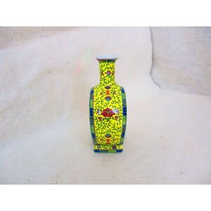 Perfect find for the collector of all things vintage & miniature. This highly detailed vibrate-colored vase has a wonderful texture & bright yellow floral colors, as many Asian stoneware pieces do! There isn't anything negative to say about this beauty. The vase, in a slightly brighter shade of yellow, is sleek and equally beautiful with its timeless shape and lines. Perfect for bud or perhaps incense sticks. A unique gift for anyone. it measures 5 x 3.5 x 1.75 inches