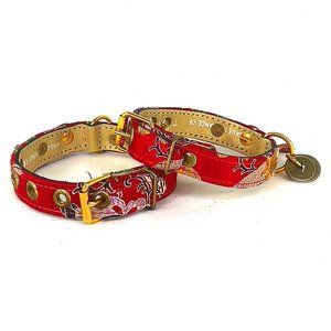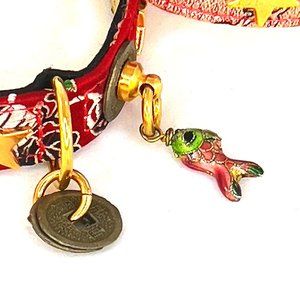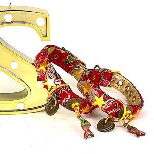 The feel of Asia is radiating from this embroidered collar. Around the sides are sewn an Asian motif accented by brass stars. Hanging from the D ring are small Chinese coins and included is a koi fish charm. Available in red and comes in XSmall 7”-9” and Small 8”-10”. Made in France by Doggidog Paris and brand new, never been used. Original price $95.
