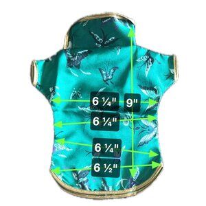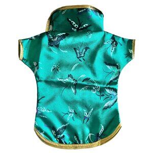 Stunning Asian style doll dress in vibrant green with contrasting red accents and faux frog closure. Beautifully crafted, offering a unique touch to any doll's wardrobe.