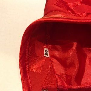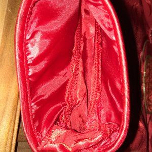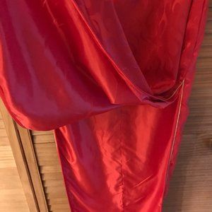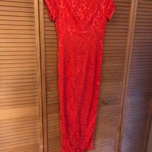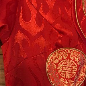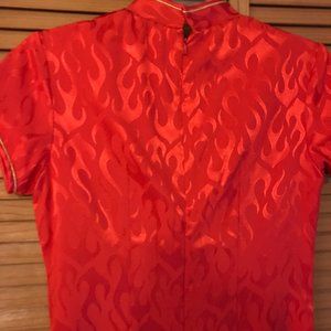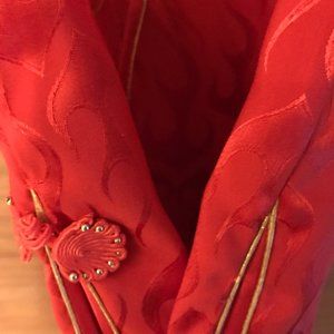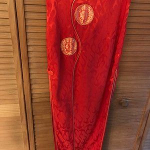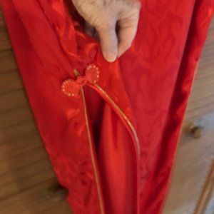 Gorgeous red long dress with Gold accents and piping. This dress is fully lined and beautifully made. It has a full back zipper. The front slits seem extra high (and sexy) The hem looks like it was glued and has come loose from age and the embellishment at the top of one slit is missing. The hem is an easy repair. This dress may have been custom designed and sewn. Doesn't show any wear or stains. Only damage is the loose hem, last picture. The second to last picture is the sewing in the armpit. Measures 56" long, 17" armpit to armpit, marked size medium. I have three Asian dresses, all from the same estate.