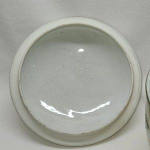 Beautiful heavy pottery pot with lid & lots of green & gold ornate details. The knob is a small dog in a lying position. The pot has an intentional faux crackle finish.
