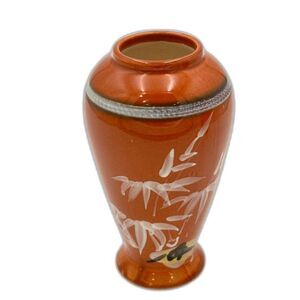 Beautiful pair of hand-painted ceramic vases featuring an Asian-inspired bamboo motif. The vases have a burnt orange/terra cotta-toned glaze with elegant white and black bamboo accents. The high-gloss finish adds depth to the intricate design. A stunning addition to any home decor, collector’s display, or vintage ceramics collection.