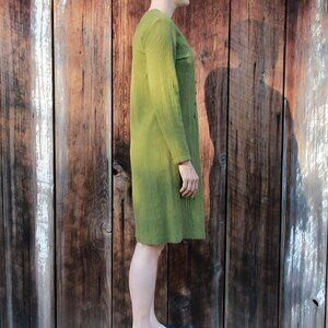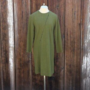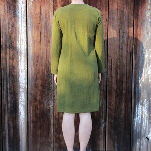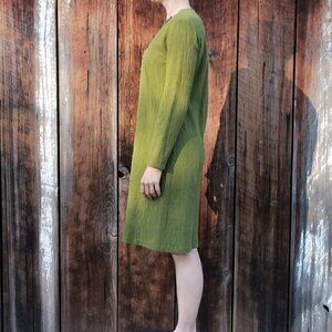 This heavy high quality green linen dress is by Asiatica Kansas City. Asiatica is a high-end fashion atelier that makes unique artisanal clothing from vintage and contemporary Japanese textiles. The dress is size M and is made of a beautiful textured green natural fabric.