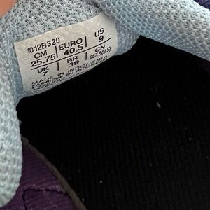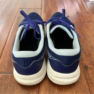 Comfortable Asics sneakers in light blue and purple. Ideal for running and casual wear.