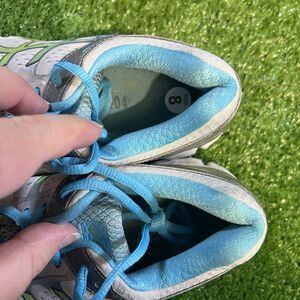 ASICS Gel-Kayano 22 running shoes for women in size 8. These durable lace-up athletic sneakers feature FluidRide technology and come in a colorway of teal, silver, and lime green with blue laces. Perfect for running, training, or casual wear. In good pre-owned condition with some signs of use, including a small stain on the left shoe as pictured. The inside tag shows style number T597Q.