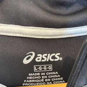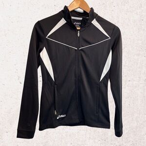 Stylish Asics jacket for kids. Black with white accents. Full zip front. Comfortable and durable.
