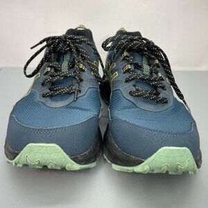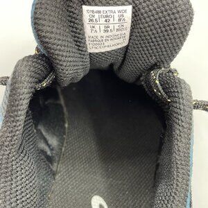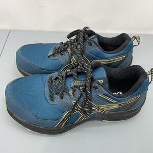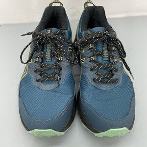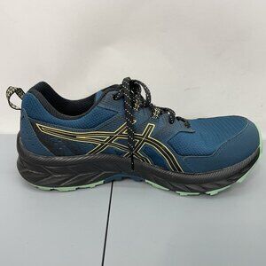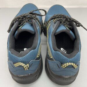Stylish Asics athletic shoes for men. Features a blue upper with yellow accents. Durable and comfortable for active wear.