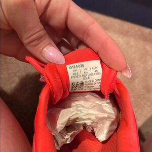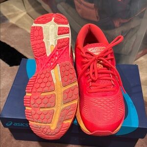 Experience the perfect blend of style and functionality with these Asics athletic shoes, featuring a vibrant red upper and striking orange accents. Designed for optimal breathability, the mesh/knit texture ensures comfort during intense workouts. The supportive midsole offers excellent cushioning, making them ideal for running and training.