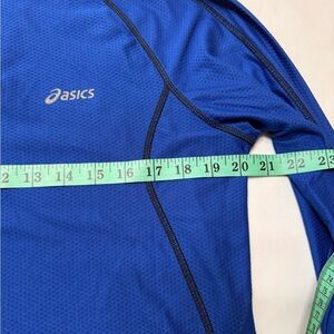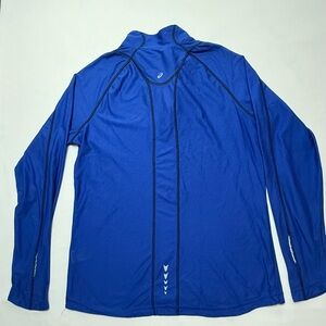 Royal blue Asics shirt with long sleeves. Features a half-zip front.