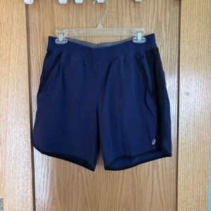 Asics lined running shorts, navy blue, size medium. Very good used condition, no flaws noted. These have pockets!