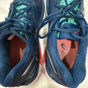 Vibrant coral sneakers with teal accents. Ideal for running and sports.