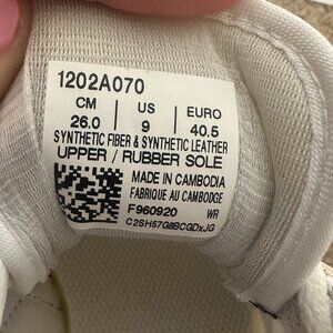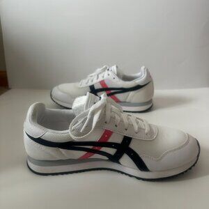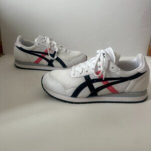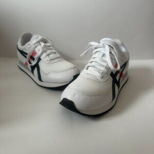 Chic Asics sneakers featuring a white base. Pink and black details add flair. Perfect for everyday wear.