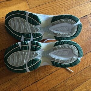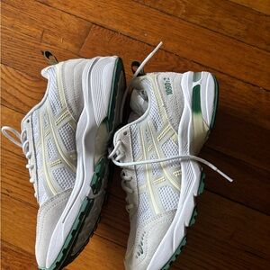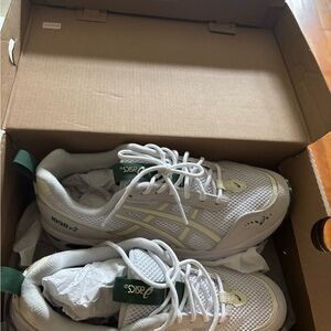 Sleek Asics sneakers in white and green. Ideal for everyday comfort. BRAND NEW WITH BOX. I ordered the wrong size and can’t return sadly
