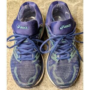 ASICS Women's Gel Nimbus 20 T850N Blue Running Shoes are lace-up sneakers in size 7.5, designed for casual wear. Featuring a blended fabric construction in a solid blue color, these sneakers have logo accents and a low-top shoe shaft style. They offer cushioning, arch support, and are lightweight, non-slip, and breathable, making them ideal for running and jogging activities. The vegan shoes also provide comfort and performance with a rubber outsole for durability. NOTE: SHOWS SOME WEAR NEAR LACES ON SHAFT- MORE ON ONE THAN THE OTHER, SEE ALL PICS FOR DETAILS, GOOD/FAIR CONDITION.