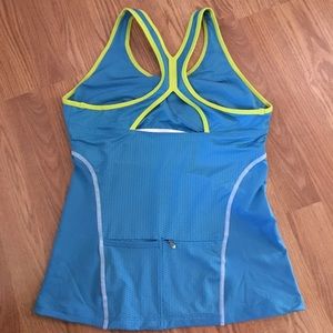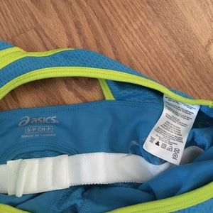 Asics perfornance tank, shelf bra, 2 pockets on the back, one zips. Light blue abd lime green. Brand new, never worn. Matches Skirt listed.