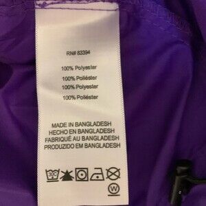 Asics purple packable coat with Teal accent zipper. jacket is water and wind resistant and reflective.