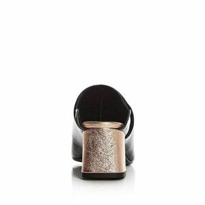 An ultra high gloss shine tops this mule by Aska. Features rich leather, tonal switching, and a contrasting covered block heel.