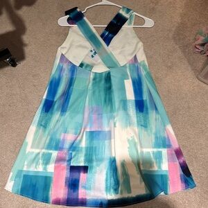 Vibrant sleeveless dress with a mix of blue, pink, and white colors. Perfect for a bold look.