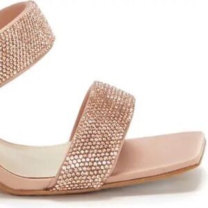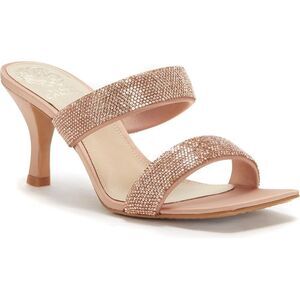 A vibrant aquamarine hue and pavé crystals enliven this square-toe sandal set on a walkable heel.