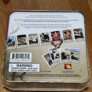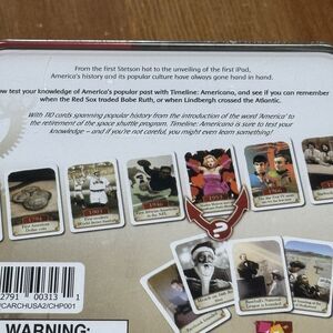 The Asmodee Card Game Timeline - Americana Box is a party game that offers a fun and educational twist on history trivia. With a minimum of 2 players and recommended for ages 8 and up, this boxed game delves into the history of Americana in an engaging and interactive way. Released in 2014 by Asmodee, this game is perfect for those looking to test their knowledge of American history in a creative and entertaining manner.