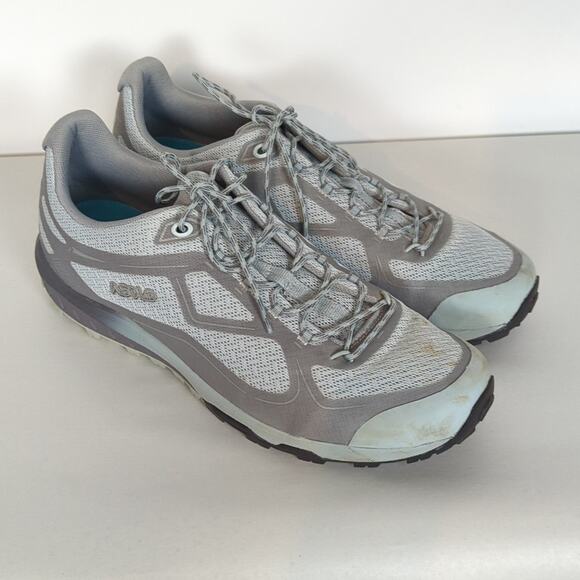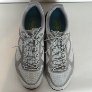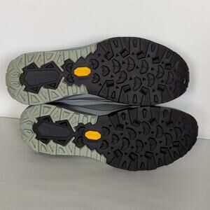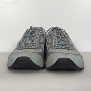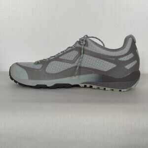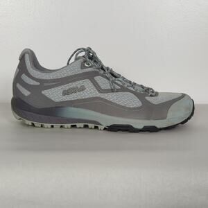 Gray. Breathable upper. Durable toe bumpers. Vibram Megagrip soles. There are some dirt marks on the toes, but these shoes are in otherwise excellent condition.