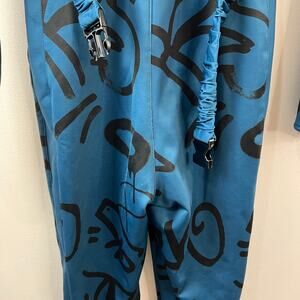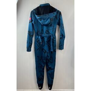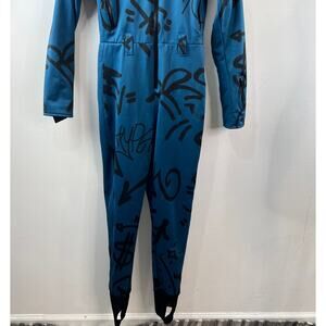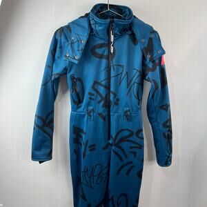 Asos 4505 Blue Black Ski Snow Suit Stretch Fitted Belted Graffiti with Hood Sz 6