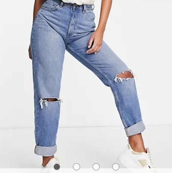 asos design high rise orginal mom jeans in light wash with rips w26 x l32