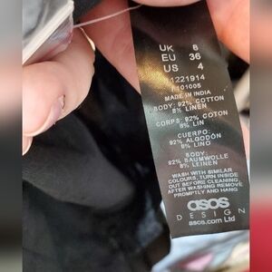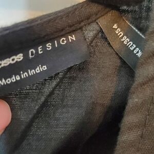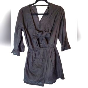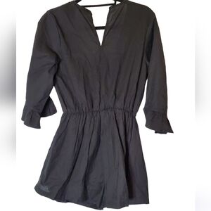 Asos Design black romper that ties in front at chest for perfect fit. Ruffle sleeve detail at elbows. Size 4. The button closure at back is missing the button, however, there is an extra button included (see pics).