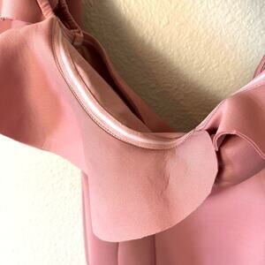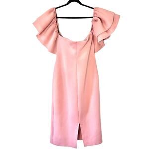 Excellent use condition! Blush pink fitted midi dress. Off the shoulder style with large avant guard ruffled statement sleeves. Ruched Bust with a back slit. Thick stretchy polyester. Sweetheart bust with inner nonslip lining around top. Great as a wedding guest dress, night out, date night or other special occasion.
