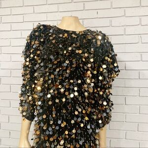 Too many sequins said no one ever. A charming sequin dress that shimmers as you go. All over embellishment. Round neck. Drape sleeves. Button-keyhole back. Length 53.” Armpit to armpit measurement lying flat 19.”
