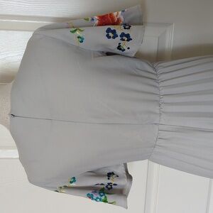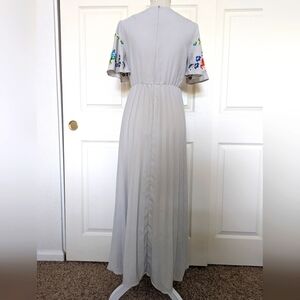 Pleated Maxi is perfect for a wedding and BUMP friendly. Empire like waistline. V-neck. Flowy sleeves. Embroidered floral design. Zipper back.