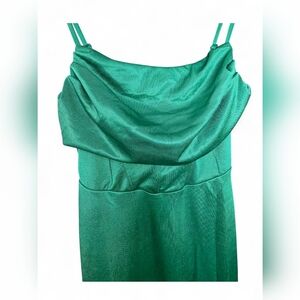 This elegant green dress is perfect for any special occasion and is brand new with tags. It has a small flaw on the front of the dress on the corset: a small snag in the material that isn't super noticeable with the cowl-neck design of the neckline. Its sleek design and corset-style offers a flattering fit. The straps are adjustable and there is a slit in the back of the skirt. Please see photos for close-ups and tag information!