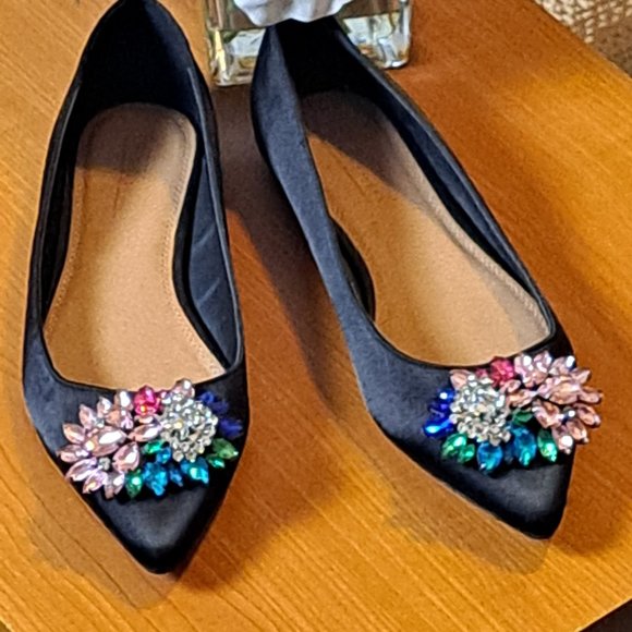 These are cute Asos Jeweled Black Satin flat shoes, but they fit like a SIZE 11-even though the shoe states size 8. I am a 10 and they are so big on me, but they are right for you. Please see the pictures and read the description.