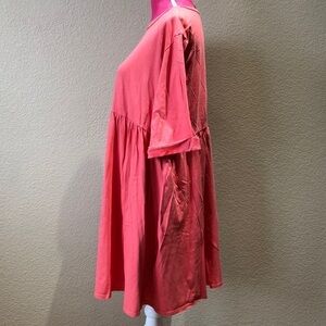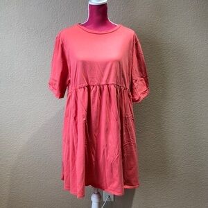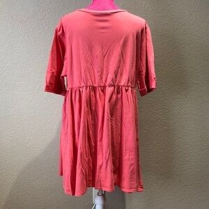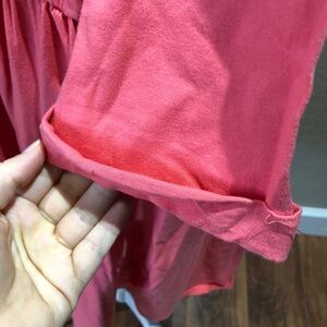 One stitch came off at the sleeve, easy fix. Color is coral. Crew neck. Relaxed fit.