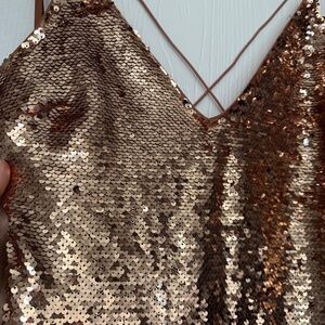 Light copper metallic sequin dress with low back and elastic criss cross straps.