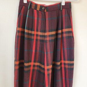 The ultimate autumn fall wardrobe staple! ASOS Plaid Checkered Pants in a colorful fall leaves palette of red, orange, maroon dark reddish brown and green. Medium weight synthetic fabric blend with a wool cozy feel, high waisted rise, tapered leg. Super cute dressed down with an oversized sweater or dressed up with a blouse for your work career professional interview workwear office wardrobe. Gently worn, excellent condition, no holes/stains.