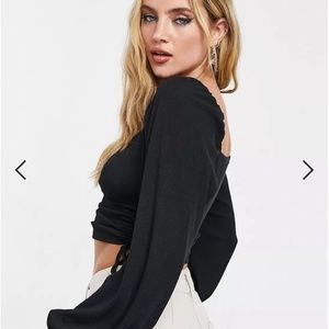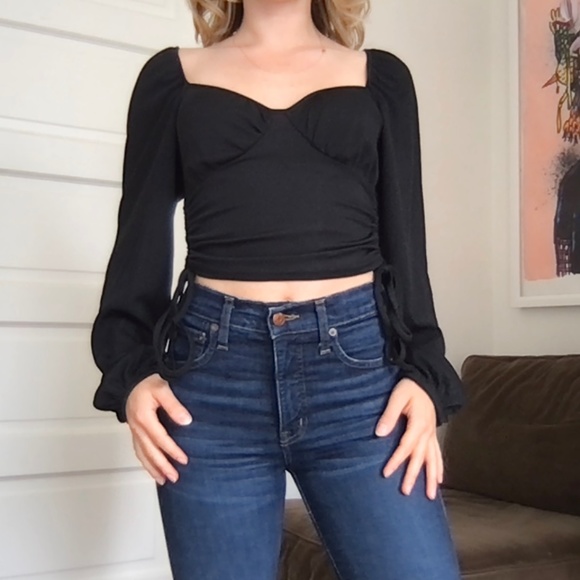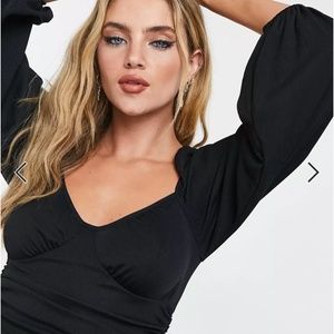 I love how many features this top has: long balloon sleeves that can be worn on or off the shoulder, a corset-like bust, and ruched sides that can be tied to adjust the length and look pretty as bows. It's a true black color and the material is ribbed polyester. My cup size is 32A, so I don't fill out the top as beautifully as the model. Size 0 is out of stock on the Asos website, but size 2 is on sale for $9. I've never worn this top because it doesn't quite flatter me as much as someone with a larger chest, so I've also decided to price this at $9 since it's good as new!