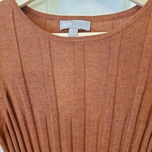 Rust orange brown ribbed long sleeve shift midi dress with side slits at the bottom for movement. Stretchy material. Perfect fall pumpkin spice vibes dress! In good used condition with no rips or stains.